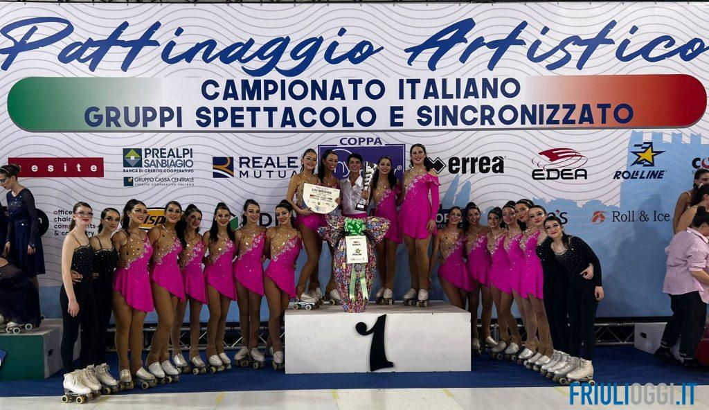 Dal Friuli, al gradino più alto del podio nazionale: due giovani atlete friulane hanno infatti conquistato la medaglia d’oro ai campionati italiani gruppi spettacolo e sincronizzato di pattinaggio artistico a rotelle nella categoria Small Sincro che si sono svolti presso la Zoppas Arena di Conegliano il 22 marzo 2024.