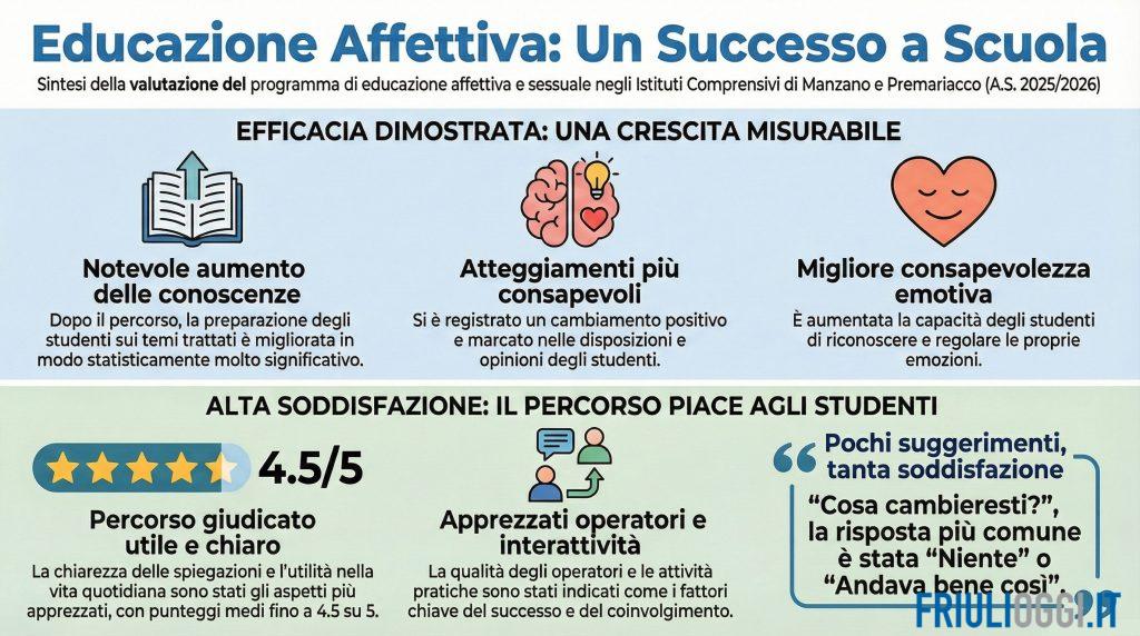 Il Distretto Socio Sanitario Natisone ha appena concluso un percorso speciale di educazione affettiva e sessuale rivolto alle classi terze delle scuole secondarie di primo grado. L’iniziativa, promossa dall’Azienda Sanitaria Universitaria Friuli Centrale (ASUFC) in collaborazione con gli Istituti Comprensivi di Manzano e Premariacco e con il Servizio Sociale dei Comuni dell’Ambito del Natisone, ha coinvolto 92 studenti, raccogliendo riscontri molto positivi.