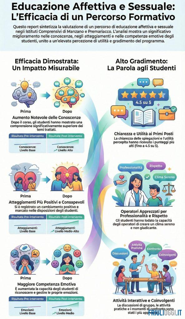 I risultati evidenziano miglioramenti statisticamente significativi in tutte le dimensioni indagate: conoscenze sui temi dell’educazione affettiva e sessuale (incremento medio-alto); miglioramento degli atteggiamenti verso le relazioni, il rispetto reciproco e la comunicazione, indicativo di una maggiore consapevolezza relazionale; un aumento della consapevolezza emotiva che segnala un impatto positivo anche sulla dimensione affettiva degli studenti.
