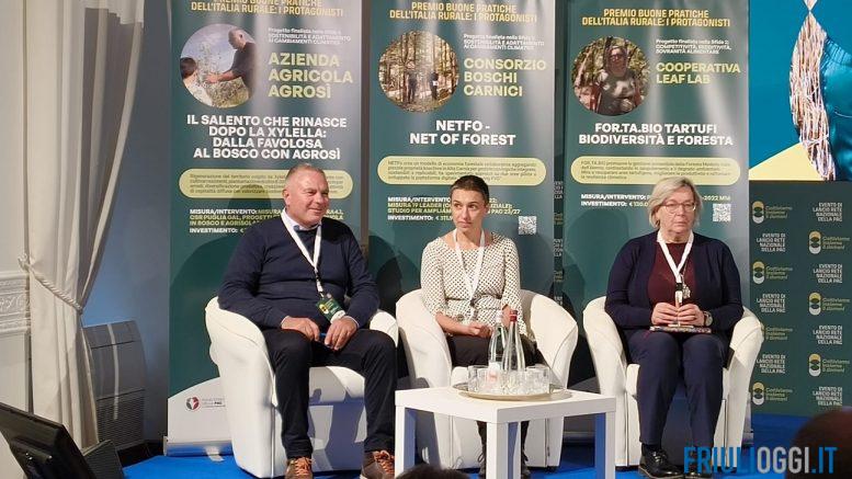 A ritirare la targa di finalista sono state Clara D’Agaro, vicepresidente del Consorzio Boschi Carnici, e Sara Di Menna, funzionario tecnico. Ad avvalorare l’importanza del progetto presentato per il concorso dalla Regione Friuli Venezia Giulia e che ha gareggiato con una trentina di altri progetti provenienti da tutta Italia, è stato direttamente Gabriele Iacolettig, Autorità di Gestione regionale del PS PAC 23-27 della Regione Autonoma FVG, che nella sua presentazione agli oltre 150 partecipanti in rappresentanza dei principali attori del mondo rurale italiano ha sottolineato: “Con questo progetto sostenuto tramite il GAL Euroleader riteniamo si possa dare una prospettiva nuova all’area e all’intero territorio montano, venendo incontro sia alle esigenze dei piccoli produttori e dei privati che comunque rappresentano una grande fetta di territorio, sia a quelle di una gestione attenta e costante del bosco che ci consente di dare risposte veloci e mirate nel caso di nuove emergenze climatiche ma che rappresenta anche un beneficio ambientale e un supporto all’economia montana”.