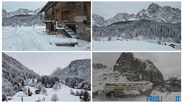 Le montagne del Friuli si sono svegliate imbiancate, dopo le copiose nevicate di questa notte. La quota neve si è abbassata fino a 500 metri sulle Alpi e a 700 metri sulle Prealpi, portando nevicate copiose su tutto l’arco montano, dal Tarvisiano alla Carnia, regalando paesaggi da cartolina invernale a pochi giorni dal Natale.