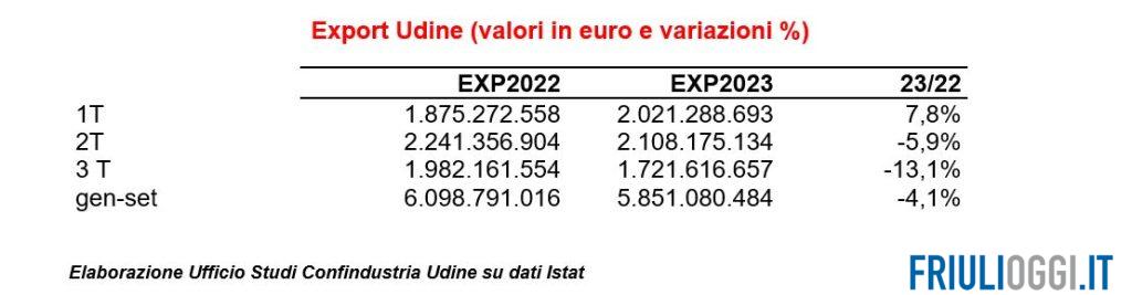 Nei primi nove mesi del 2023, secondo le elaborazioni dell’Ufficio studi di Confindustria Udine su dati Istat, le esportazioni della provincia di Udine, in valore, hanno registrato un calo del 4,1% rispetto allo stesso periodo dell’anno precedente (da 6.099 a 5.851 milioni di euro).