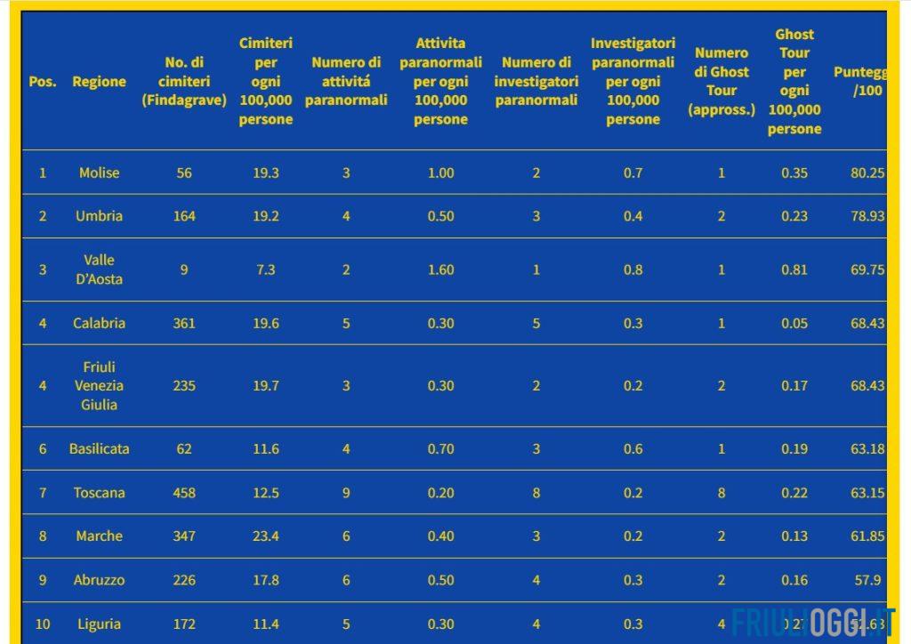 Per stilare questa “classifica da brividi”, sono stati analizzati vari fattori tra cui il numero di cimiteri, le segnalazioni di attività paranormali, la presenza di investigatori del paranormale e il numero di ghost tour organizzati. Sulla base di questi dati, è stato calcolato per ciascuna regione un “Halloween Score”, per rivelare dove le leggende spettrali italiane siano più vive che mai. Ebbene, il risultato è che il Friuli Venezia Giulia è tra le regioni “più spaventose£ d’Italia: appena fuori dal podio, detiene il quarto posto (assieme alla Calabria).