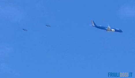 Sono le prime ore del pomeriggio di lunedì 22 agosto quando si sente un frastuono nei cieli del Friuli. Le teste si cominciano ad alzare e quello che vedono gli occhi di molti in provincia di Pordenone e Udine è un aereo della compagnia italiana Ita scortato da due caccia. Tra San Vito al Tagliamento e San Daniele del Friuli fa larghissimi cerchi.