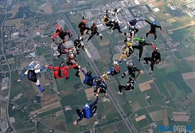 Si sono “buttati” nel vuoto, da 5200 metri di altezza: è l’impresa che è valsa il record italiano a 23 persone (il precedente era di 19) dopo il lancio col paracadute in formazione “hup”, ad una velocità media di 266 chilometri orari. Tra questi, c’è anche un friulano.