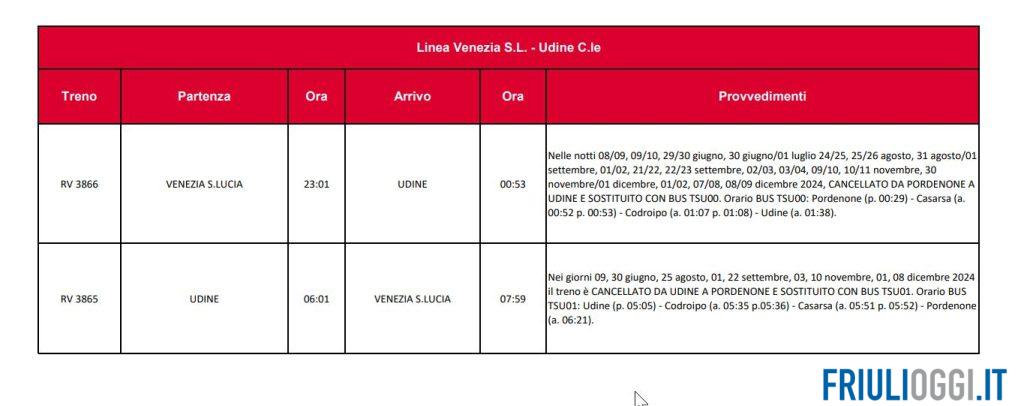 I treni regionali 3402, Venezia Santa Lucia (23:01) – Udine (0:53) e 3865, Udine (6:01) – Venezia Santa Lucia (7:59), saranno cancellati; previsto servizio con corse bus fra Pordenone e Udine nei giorni 9 e 30 giugno, 25 agosto, 1 e 22 settembre, 3 e 10 novembre, 1 e 8 dicembre 2024.