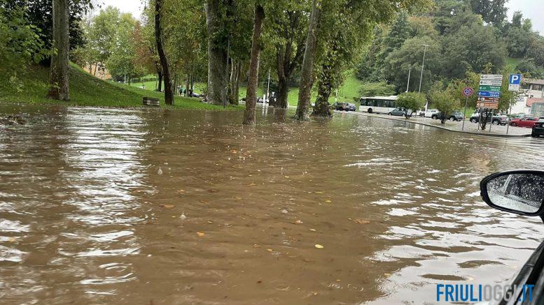 Strade trasformate in piscine, acqua che scorre giù dalle scalinate come un torrente, disagi alla viabilità: nel pomeriggio di oggi, 10 ottobre, una forte pioggia è caduta su Udine portando ad allagamenti, tombini intasati e rallentamenti del traffico. L’emiciclo di Piazza Primo Maggio, come si può vedere nella foto, è diventato un lago. Acqua in strada e negli scantinati anche nell’ultimo tratto di via Baldasseria Media.