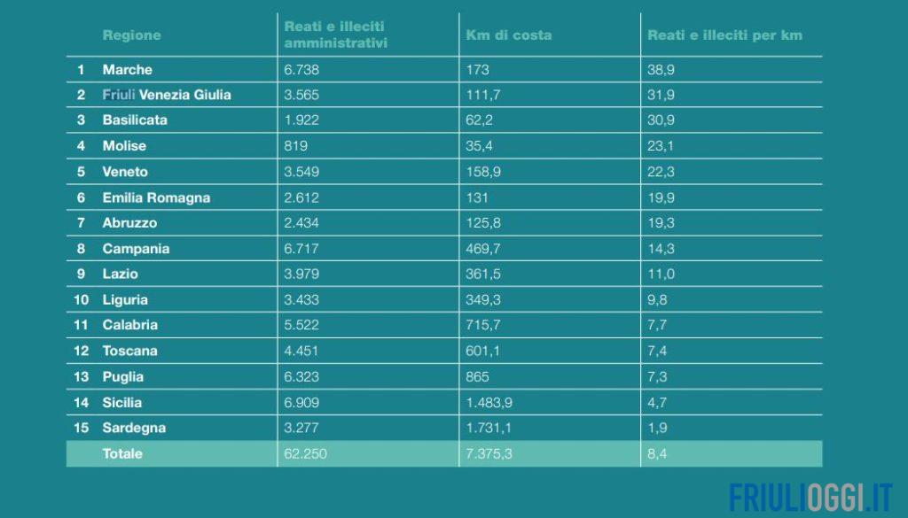Se si guarda ai numeri assoluti, il Friuli Venezia Giulia non è in alto nella classifica di reati e illeciti lungo le sue coste, ma se si guarda al rapporto tra illeciti e chilometri di litorale, la situazione cambia drasticamente e la nostra regione si guadagna un triste secondo posto in Italia: è quanto emerge dalla nuova edizione di Mare Monstrum, il rapporto di Legambiente su abusivismo edilizio, inquinamento, pesca illegale lungo le coste italiane.
