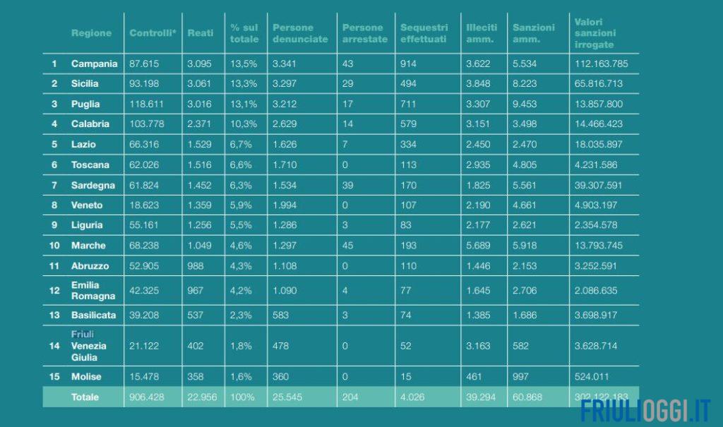 Un reato su due (50,3%) si concentra nelle 4 regioni a tradizionale presenza mafiosa, Campania (3.095 illeciti penali), Sicilia (3.061), Puglia (3.016) e Calabria (2.371), che guidano nell’ordine, come numeri assoluti, la classifica regionale, seguite dal Lazio (1.529 reati) e dalla Toscana (1.516). Nelle prime dieci regioni figurano Sardegna, Veneto, Liguria e Marche. Proprio questa regione è, invece, la prima come numero di illeciti complessivi (reati e violazioni amministrative) per km di costa (38,9), seguita da Friuli-Venezia Giulia (31,9 illeciti per km) e Basilicata (30,9).