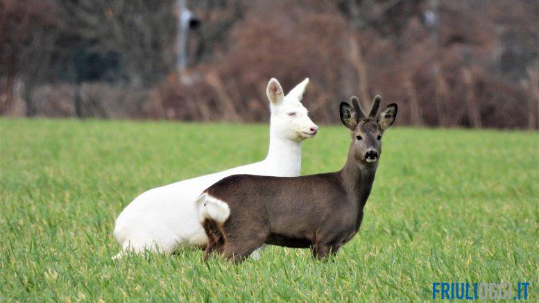 Con un manto così candido, spicca sullo sfondo della campagna friulana e tra i suoi simili: è un capriolo albino, una femmina, immortalata nella Destra Tagliamento, dove pare vivere da un po’ di tempo.