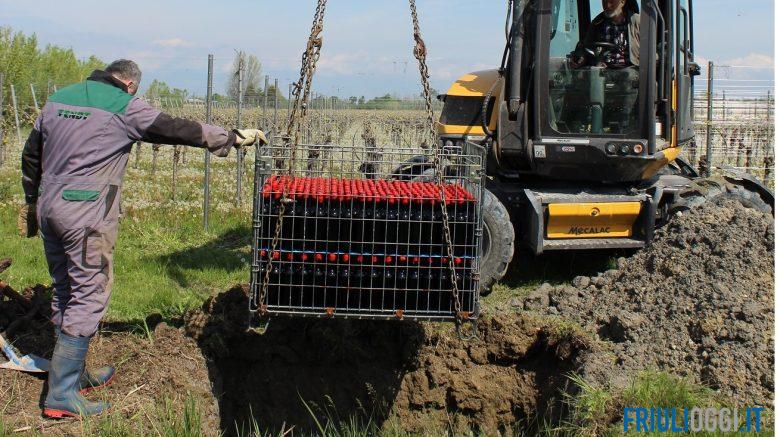 “Dal punto di vista tecnico – aggiunge il direttore, Rodolfo Rizzi -, le bottiglie di Refosco verranno interrate nel vigneto da dove sono state vendemmiate le uve che l’hanno creato, a una profondità tale da incrociare le acque di risorgiva del fiume Tagliamento che, qui, sono abbastanza superficiali. Per 12 mesi, dunque, l’evoluzione e l’affinamento di questo vino rosso, avverrà in un ambiente protetto da interferenze esterne e in maniera assolutamente naturale. Una tecnica enologica nuova e mai sperimentata prima d’ora in Italia. Fondamentale, durante questo innovativo affinamento, sarà l’assenza totale di luce e soprattutto di rumori che potrebbero, in qualche modo, modificare negativamente l’aspetto organolettico del vino. Un ruolo importante, durante questo periodo, lo avranno anche le acque di risorgiva che sapranno regolare la temperatura interna del suolo. Tra un anno, prima di etichettare e porre in vendita le bottiglie, dopo attente analisi, saremo in grado di verificare, attraverso una degustazione con i migliori esperti del settore, le evoluzioni qualitative di questo vino che ha trascorso 365 giorni di assoluto riposo. Giorni passati al buio, nel silenzio più totale del sottosuolo dove solo il lentissimo movimento delle radici della sua pianta madre lo poteva cullare”.