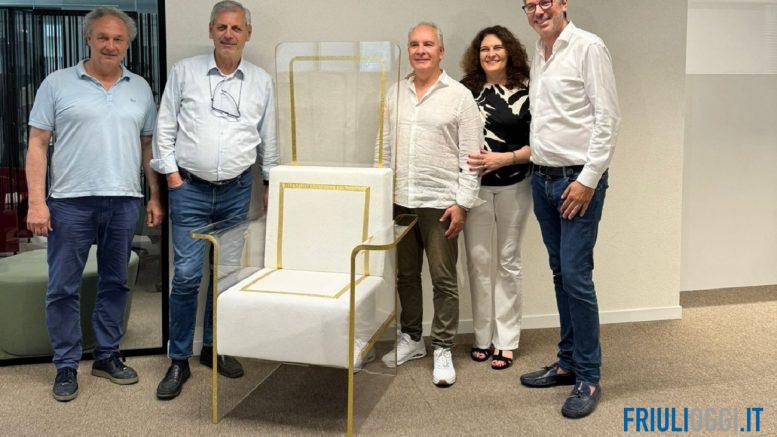 Si tratta di una vera e propria opera d’arte, di abilità e maestria artigianale made in Friuli, concertato da un pool d’ imprenditori del Distretto della sedia ed aziende del territorio, che si sono resi disponibili a finanziare e sostenere quest’importante progetto. La realizzazione pratica è stata curata da Linea Fabbrica di Manzano, Coggiola Minini Group di Cassacco e, per la parte degli imbottiti, dalla Tecnosft.