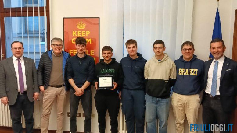 In ragione della scelta di realizzare il video in lingua friulana, l’ARLeF – Agenzia regionale per la lingua friulana ha voluto ringraziare i giovani con una targa che recita “Pal impegn te promozion de lenghe furlane”. A consegnare il riconoscimento sono stati il presidente dell’Agenzia, Eros Cisilino e il direttore William Cisilino. Gli studenti erano accompagnati dal Direttore del CFP Bearzi, Giulio Armano e dal loro coordinatore prof. Edoardo Berini.
