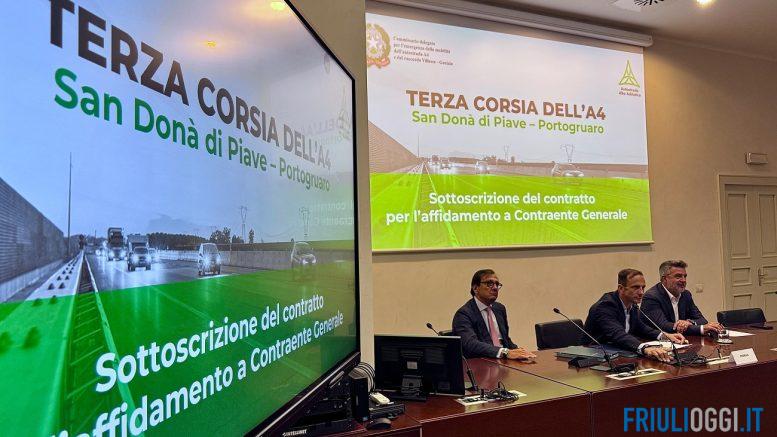 È stato firmato oggi a Trieste il contratto per l’affidamento da parte di Autostrade Alto Adriatico dei lavori di realizzazione della terza corsia della A4, nel tratto tra San Donà di Piave e Portogruaro al Consorzio Stabile Eteria (Vianini Lavori spa, Itinera spa e I.Co.P spa). Un’opera dal valore di 870 milioni di euro — su un progetto complessivo che supera i 2 miliardi — che non si limita a un semplice allargamento dell’autostrada, ma ne prevede un completo rifacimento per migliorare fluidità, sicurezza e capacità di traffico sul Corridoio V, asse strategico della rete transeuropea dei trasporti.