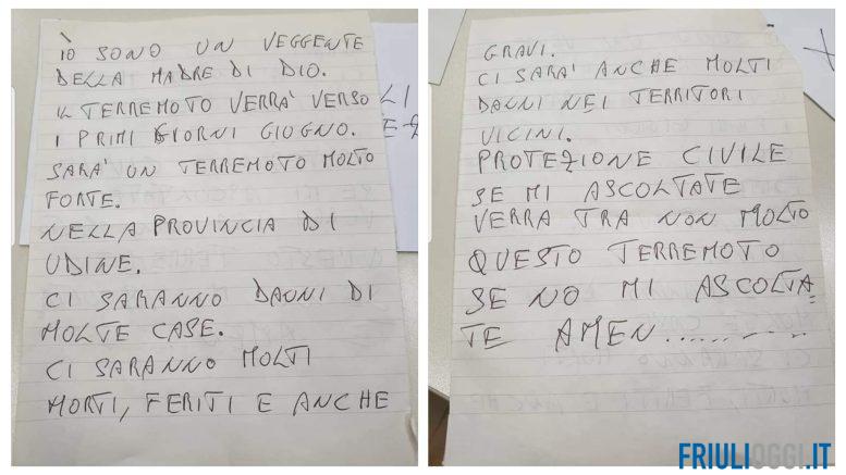 “Io sono un veggente della madre di Dio – scriveva nella lettera indirizzata all’assessore Bottacin – . Il terremoto verrà verso i primi giorni di giugno. Sarà un terremoto molto forte, nella provincia di Udine. Ci saranno danni in molte case. Ci saranno molti morti, feriti anche gravi. Ci saranno anche molti danni nei territori vicini. Protezione civile, se mi ascoltate verrà tra non molto questo terremoto, se non mi ascoltate Amen”.