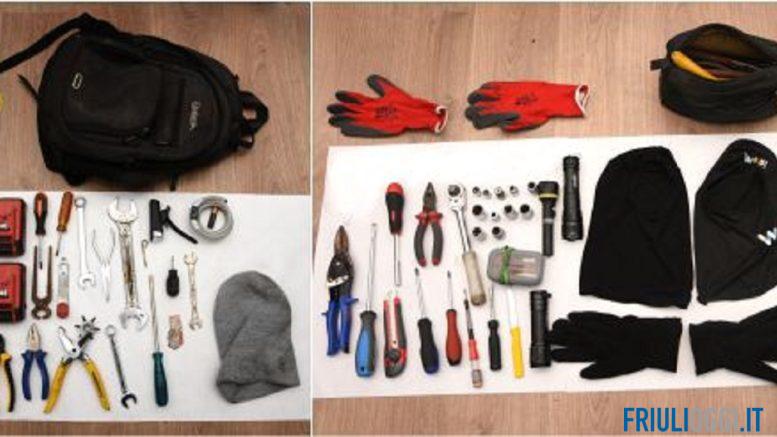La perquisizione ha dato esito positivo: occultati all’interno di due zaini sono stati rinvenuti dei passamontagna, guanti, una smerigliatrice angolare (flex), un manganello, un coltello, delle pinze, un taglierino, delle torce, cacciaviti e chiavi da lavoro di diversa misura. Tutto il materiale e l’autovettura sono stati posti sotto sequestro.