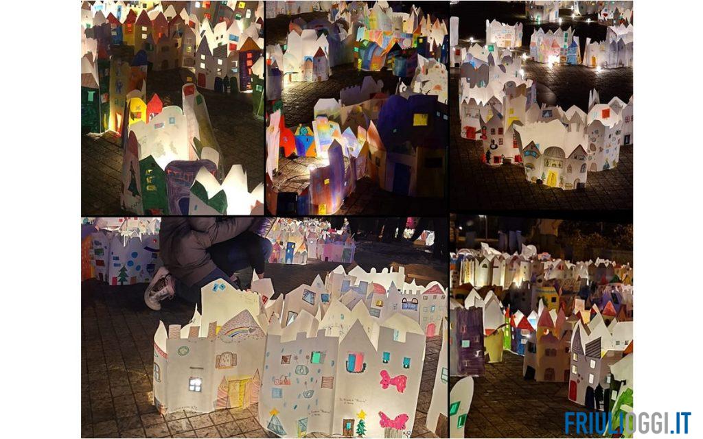 Tante casette colorate e illuminate, costruite con il cartoncino una di fianco all’altra: una città nella città è sorta in piazza Transalpina a Gorizia, realizzata dai bambini delle scuole del capoluogo isontino e di Nova Gorica.
