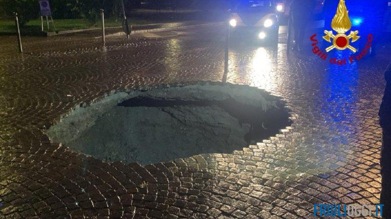 Non solo allagamenti: l’ondata di maltempo, che ha interessato in modo particolare l’area dell’Isontino, ha causato anche un importante cedimento stradale. Una vera e propria voragine, di oltre due metri di diametro, si è aperta nella notte in via Cadorna, a Gorizia.