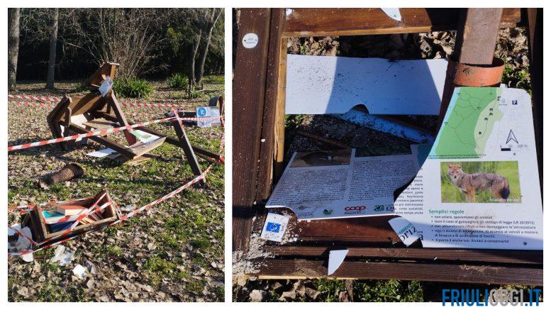 “Sono state abbattute la bacheca all’ingresso del Parco, divelta la fontana in ghisa, distrutta la piccola biblioteca per il bookcrossing e dato fuoco ad alcuni libri, danneggiati i pannelli descrittivi del Parco, in italiano e sloveno, recentemente collocati da Legambiente Gorizia Aps, che ne è tuttora proprietaria, realizzati con il contributo di Coop Alleanza 3.0 e frutto di accurato studio scientifico” sostengono.