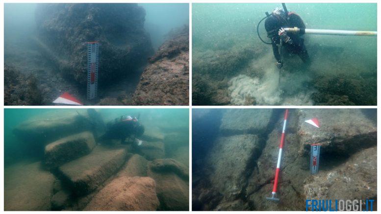 L’Università di Udine è tornata sulle Piere di San Gottardo a 90 anni dalle prime esplorazioni subacquee per condurre una documentazione di dettaglio, partendo dal settore più meridionale. Qui è stato osservato un accostamento di elementi lapidei non casuale, anche nell’orientamento. Le verifiche subacquee hanno constatato che alcuni di questi elementi hanno tracce di lavorazione che ne suggerirebbero una originaria funzione architettonica. Al momento non è invece certo se tutti, o solo in parte, possano essere materiali di reimpiego. Se, infatti, gli elementi lineari potrebbero essere stati utilizzati per la prima volta in questa che sembra essere un’opera marittima, ciò risulta meno probabile per quelli lavorati e abbastanza inverosimile per i monumenti iscritti recuperati nel secolo scorso, nonché una inedita ara funeraria individuata proprio in occasione di queste nuove ricerche.