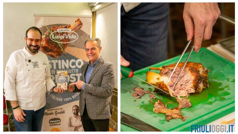“Questa è una giornata particolare perché, nonostante il prodotto sia già stato presentato, ora possiamo mostrare alle persone come apprezzarne davvero la qualità e trattarlo al meglio”. Con queste parole lo chef friulano Kevin Gaddi, insignito anche della targa di Ambasciatore del Gusto italiano, ha introdotto all’hotel Là di Moret il suo stinco di prosciutto arrosto, nato dalla collaborazione con l’azienda friulana Salumi Vida.