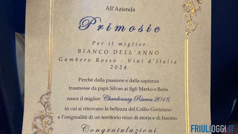 “Un Bianco di Gorizia è nel gotha dei vini. Con grande orgoglio rendiamo merito all’azienda Primosic, dimostrazione concreta di come la passione sia necessaria per realizzare produzioni di pregio”, ha esordito il sindaco. E rivolgendosi direttamente al capostipite della famiglia, ha proseguito: “Il vino è uno strumento eccezionale per la promozione del territorio, ne incarna la storia, le peculiarità e lo spirito. La vostra azienda porta in alto nel mondo il nome della nostra città, quindi per noi è un patrimonio di grandissimo valore”. Concetti ribaditi anche dall’assessore comunale al Turismo, Luca Cagliari. Era presente alla consegna anche la direttrice del Gect, Romina Kocina.
