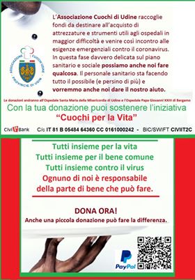 L’associazione Cuochi di Udine sta organizzando una raccolta fondi per l’ospedale della città e il papa Giovanni XXIII di Bergamo. Le donazioni sono destinate all’acquisto di attrezzature e strumenti utili al personale medico, in prima linea contro il coronavirus.