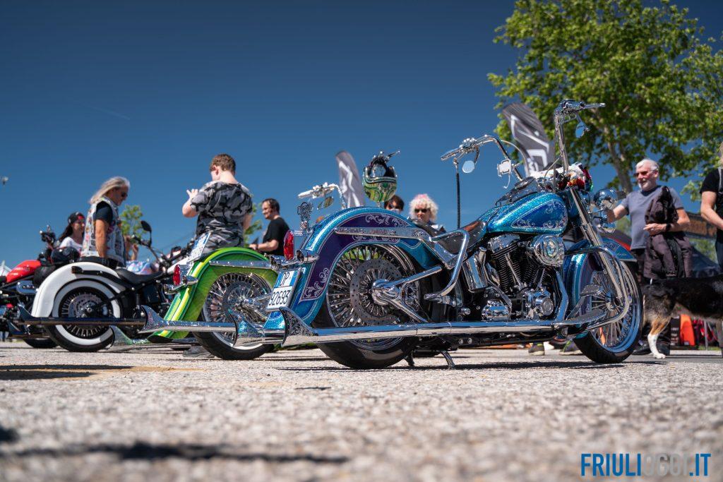 La novità della BFI 2024 è stata il Chicano Show dedicato alle “vicla”, le spettacolari lowrider in stile messicano che non fanno economia di cromo, verniciature flake e dettagli in foglia oro e argento. La più apprezzata è stata l’Harley-Davidson Softail Heritage dell’officina varesina Rckroll-Chop, già cover star del numero di maggio di Bikers Life Magazine.