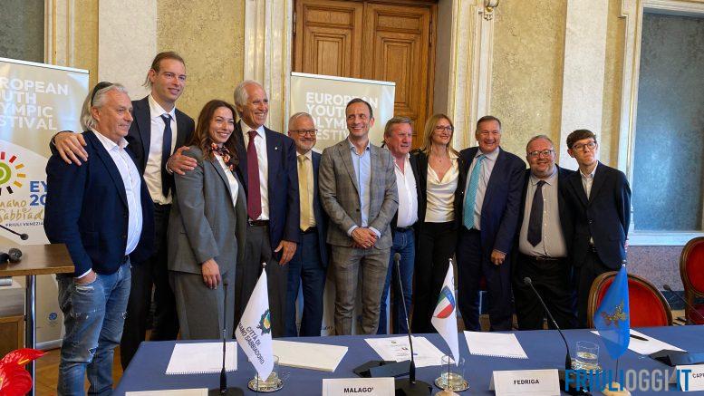 A siglare l’accordo: il presidente del Friuli Venezia Giulia Massimiliano Fedriga, il presidente del CONI Giovanni Malagò, quello del Comitato Olimpico Europeo Spyros Capralos, il sindaco di Lignano Laura Giorgi, l’executive president EYOF Giorgio Brandolin, il vicegovernatore Mario Anzil e Liney Halldorsdottir del Comitato EYOF. Presenti anche la campionessa olimpica Mara Navarria e il delegato CONI Andrea Marcon.