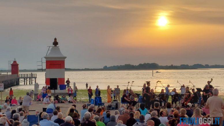 Sono state più di 3mila le persone che si sono date appuntamento alle 5 di mattina sul litorale, per lasciarsi ammaliare dalle note dell’Accademia d’Archi Arrigoni, guidata dal maestro Domenico Mason e con i violinisti solisti Christian Sebastianutto e Francesco Comisso. Il pubblico ha così potuto ammirare il sole sorgere sul mare tra le note di Vivaldi, Bach e Mozart, nonché dell’Inno d’Italia.