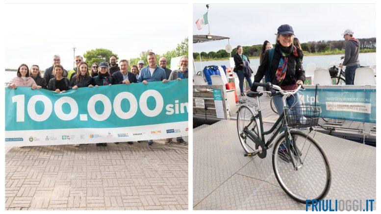 Per festeggiare questo traguardo, ieri, venerdì 13 settembre, è stato premiato il fortunato 100.000° passeggero: si chiama Veronika Seegis ed è originaria di Horb am Neckar bei Freudenstadt vicino Stuttgart (Stoccarda) nel Baden – Wüttenberg. Era in vacanza con i figli al campeggio Sabbiadoro da domenica scorsa e si fermeranno nella località balneare friulana fino a martedì. Stava rientrando a Lignano Sabbiadoro quando è stata accolta da un caloroso applauso. Inoltre, ha ricevuto in omaggio degli articoli di abbigliamento della linea Pineta Art e diversi gadget (di Marina Uno, Bike&Go e Illiria) e due voucher da utilizzare il prossimo anno, uno messo a disposizione dal Consorzio Lignano Holiday, valido per due persone e tre notti a Lignano Sabbiadoro, e un secondo reso disponibile dal Consorzio Bibione Live, dello stesso valore, per la città di Bibione.