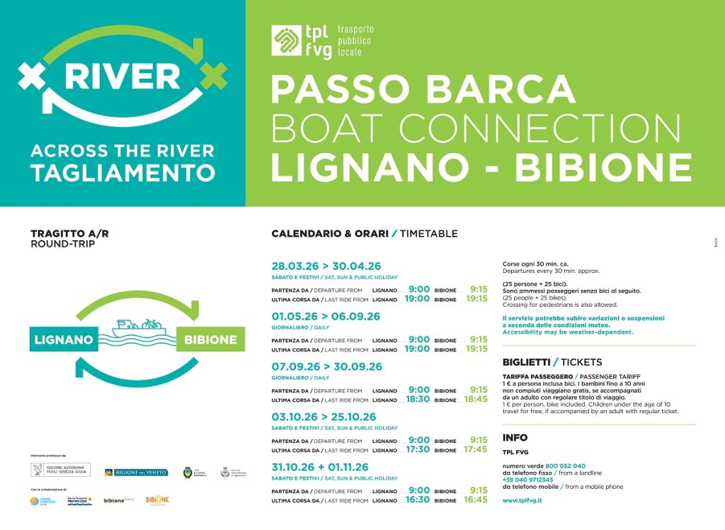 L’imbarco a Lignano è situato presso il porto turistico Marina Uno, mentre a Bibione l’approdo si trova lungo la pista ciclabile che conduce al Faro. Il servizio è particolarmente indicato anche per i ciclisti: è infatti possibile imbarcare biciclette, favorendo una mobilità sostenibile e integrata. Il traghetto può trasportare fino a 25 persone con bici al seguito, con corse ogni 30 minuti.