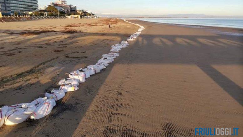 Sacchi per proteggere la spiaggia di Lignano dalle mareggiate.
