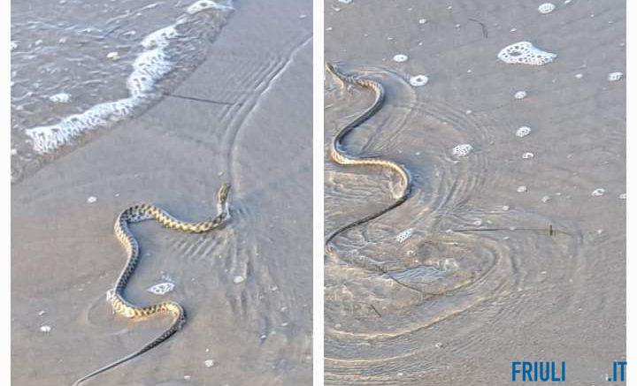 Avvistamento inusuale e che ha creato un po’ di scompiglio tra i turisti che passeggiavano sul bagnasciuga di Lignano: oggi, infatti, proprio in riva al mare, sono stati immortalati due serpenti che sono pure entrati in acqua.