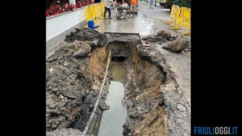 A confermare la dinamica, il Direttore del dipartimento fognature di Cafc, Alessandro Florit, in sopralluogo a Lignano Sabbiadoro già nel pomeriggio di lunedì: “un tratto della condotta, del diametro di 50 centimetri, posata a circa 2 metri di profondità e posizionata sul lato ovest della strada, ha subito un cedimento e di conseguenza l’asfalto in superficie si è aperto“, spiega il tecnico di C.a.f.c.