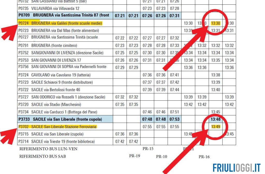 L’abbonamento scolastico, sostengono i genitori, prevede la corriera da Brugnera fino a Sacile San liberale, e poi in treno fino a Maniago. Solo che la corriera P34 parte dall’istituto di Brugnera alle 13.30 e arriva in stazione Sacile San Liberale alle 13.49, mentre il treno regionale TR 17384 parte alle 13.48, un minuto prima, e non attende l’arrivo della corriera. E i ragazzi perdono così la coincidenza.
