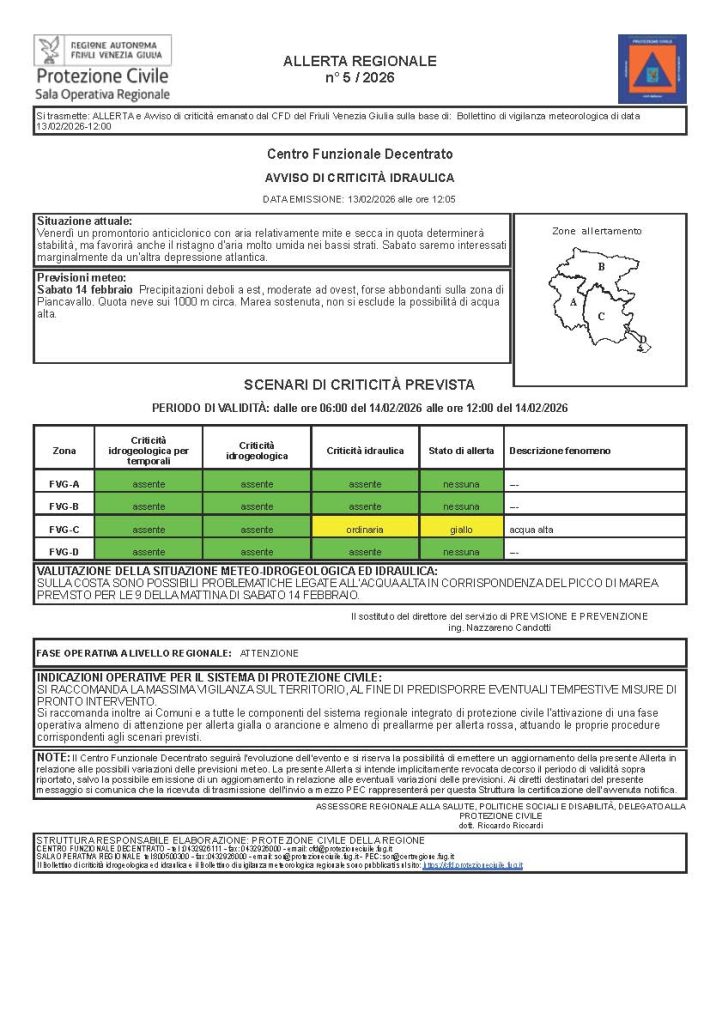 Maltempo in Friuli Venezia Giulia dove la Protezione Civile ha diramato un’allerta meteo valida dalle ore 6 alle 12 di domani, sabato 14 febbraio 2026, in previsione di un peggioramento delle condizioni atmosferiche. Pur non trattandosi di un evento di particolare intensità, la situazione potrebbe comunque provocare disagi circoscritti, soprattutto nelle zone montane e lungo la fascia costiera, dove la combinazione tra precipitazioni e marea sostenuta impone un livello di attenzione più elevato.
