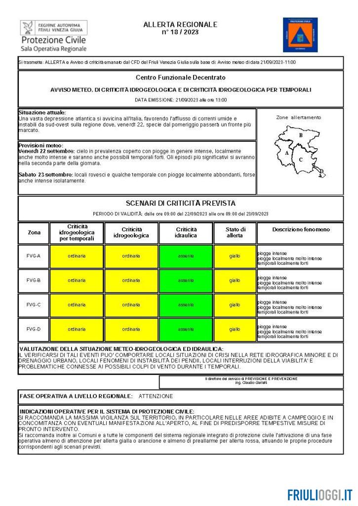 Nuova ondata di maltempo in arrivo in Friuli Venezia Giulia dove la Protezione Civile della regione Friuli Venezia Giulia ha emanato un’allerta meteo dalle ore 09:00 di domani, 22 settembre, fino alle ore 09:00 del 23 settembre. La situazione è in continua evoluzione, ma finora sembra che la regione dovrà fare i conti con piogge intense, temporali e rovesci abbondanti.