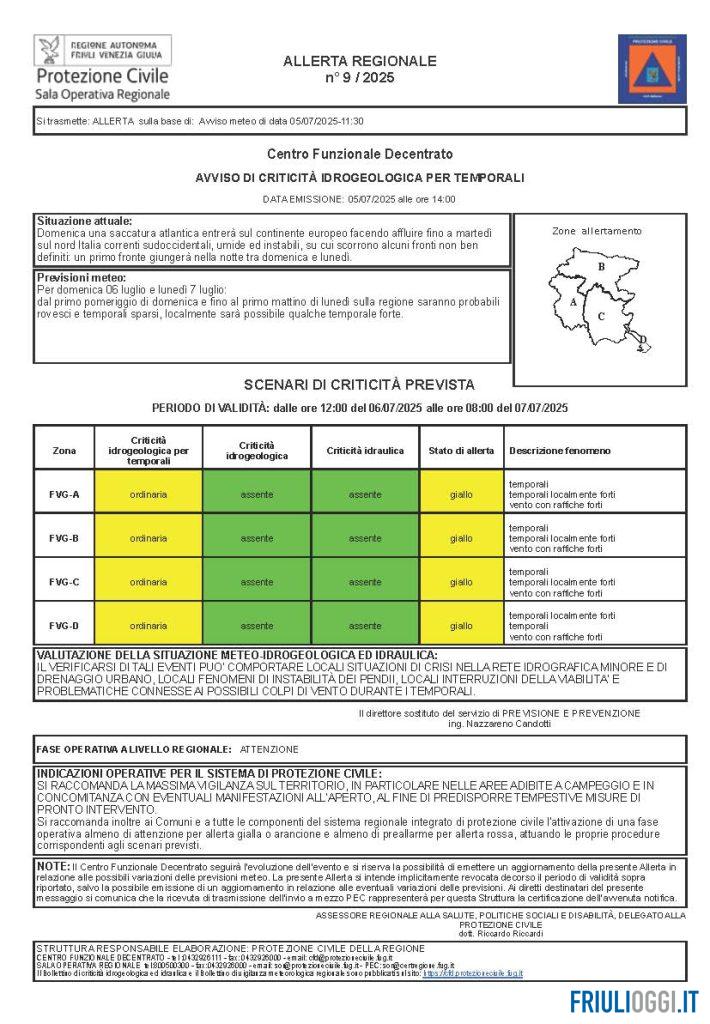 La Protezione Civile del Friuli Venezia Giulia ha diramato un’allerta meteo valida dalle ore 12:00 di domenica 6 luglio alle ore 08:00 di lunedì 7 luglio 2025. Si prevede l’arrivo di rovesci e temporali sparsi su tutta la regione, con possibilità di fenomeni intensi e localmente pericolosi.