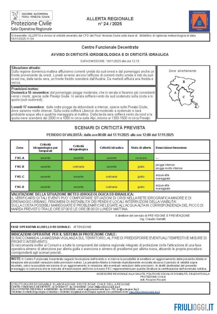 Scatta l’allerta meteo sul Friuli Venezia Giulia, con un avviso diramato dalla Protezione Civile regionale valido dalla mezzanotte fino alle 12 di lunedì 17 novembre per l’arrivo di condizioni meteo avverse, con piogge intense, venti forti, rischio di mareggiate e possibili disagi nelle aree montane e costiere.