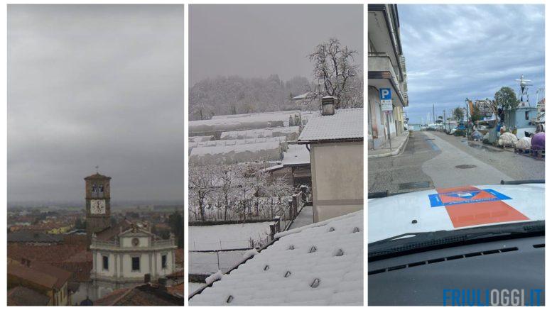 La neve sta interessando tutta la zona montana, con quota già attorno ai 300 metri al mattino. Sulle Prealpi Carniche si registrano 10-15 centimetri di neve fresca, mentre altrove gli accumuli variano tra 0 e 10 centimetri.