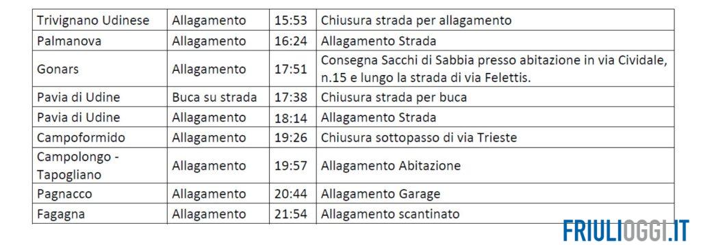Dall’inizio dell’allerta meteo, la Sala Operativa Regionale ha ricevuto numerose segnalazioni di allagamenti e criticità diffuse: strade chiuse a Trivignano Udinese, Palmanova e Campoformido, abitazioni e garage allagati a Campolongo–Tapogliano, Pagnacco e Fagagna, oltre a buche stradali e interventi di emergenza con sacchi di sabbia a Gonars e Pavia di Udine. Si segnalano inoltre interruzioni della corrente elettrica in Val Resia e almeno 15 chiamate al Numero Unico di Emergenza 112 riconducibili al maltempo a partire dalla tarda serata.
