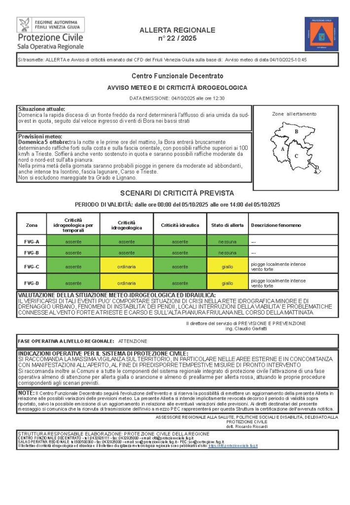 Non si escludono inoltre mareggiate lungo il litorale, in particolare tra Grado e Lignano, con disagi possibili per la viabilità e i collegamenti marittimi.
