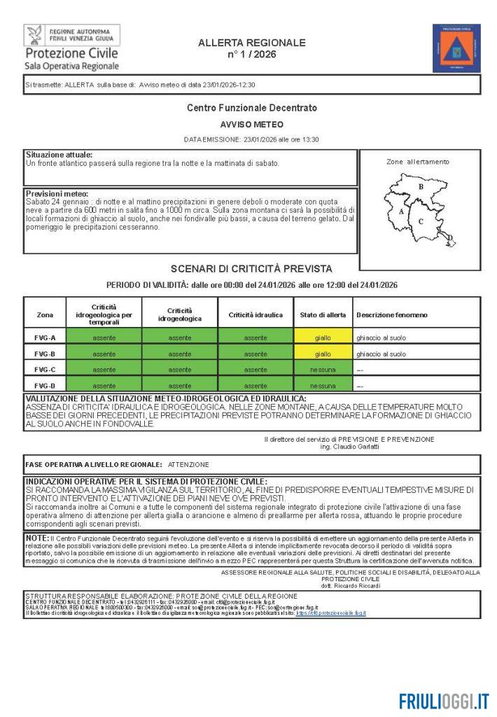 Neve e gelate in Friuli Venezia Giulia: scatterà dalla mezzanotte di oggi l’allerta meteo diramata dalla Protezione Civile e resterà in vigore fino alle ore 12:00 di domani, in concomitanza con il passaggio di un fronte atlantico previsto tra la notte e la mattinata.