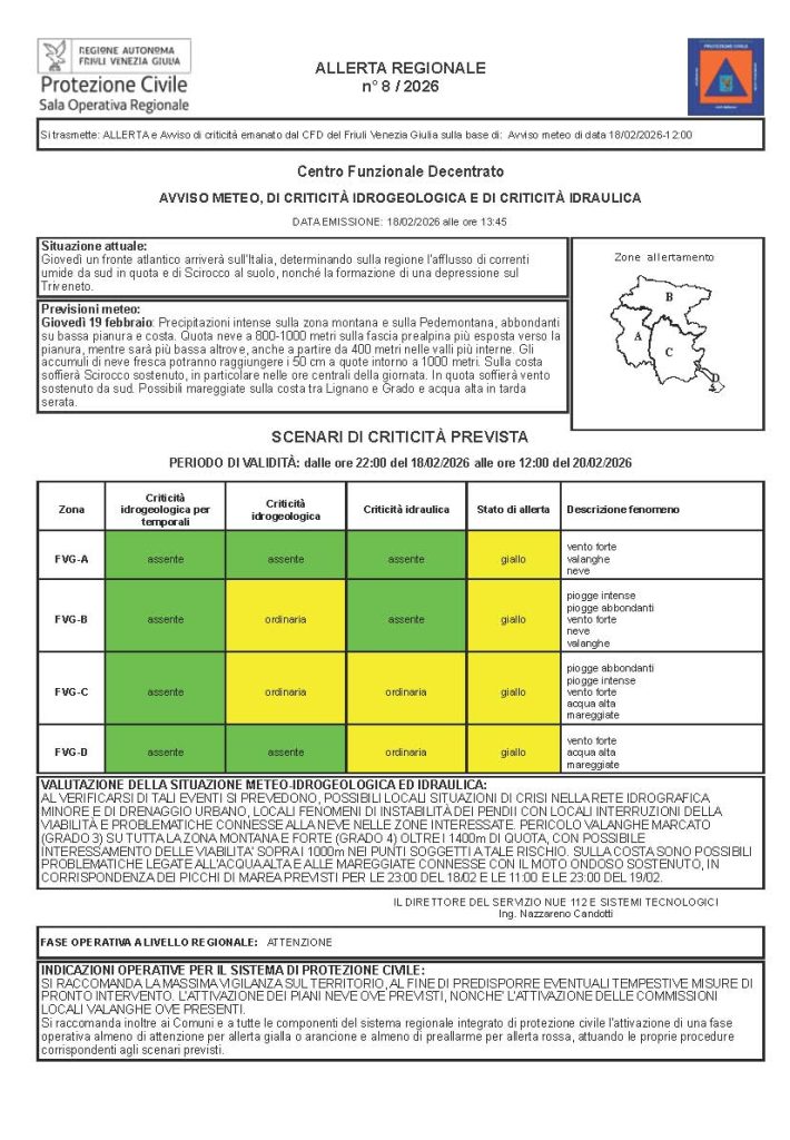 Nuova allerta meteo della Protezione Civile della Regione Friuli Venezia Giulia in vigore dalle ore 22:00 di questa sera, mercoledì 18 febbraio 2026, fino alle ore 12:00 di venerdì 20 febbraio. L’avviso riguarda l’intero territorio regionale e segnala un deciso peggioramento delle condizioni atmosferiche, con precipitazioni intense, nevicate abbondanti in montagna e possibili criticità lungo la costa.