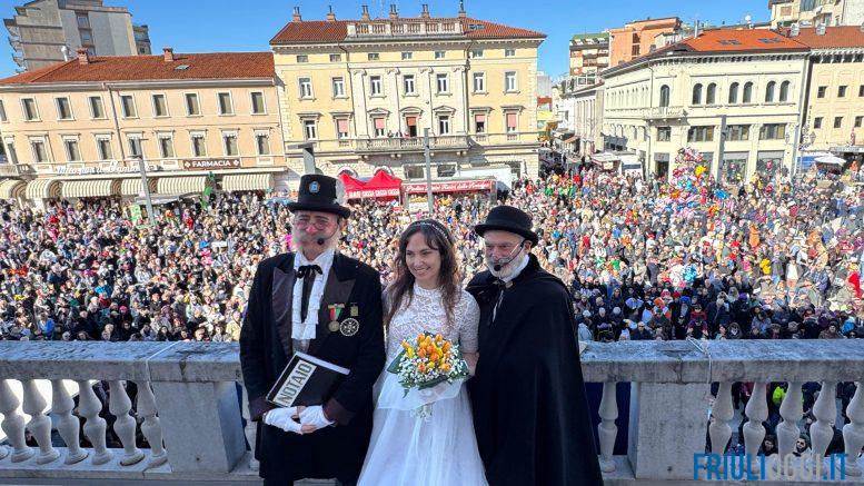 Alle 11.30 piazza della Repubblica era già gremita: lo speaker Louis Guglielmero ha lanciato il conto alla rovescia. A mezzogiorno il corteo è entrato in piazza per l’alzabandiera sulle note dell’Inno a Monfalcone; dal terrazzo del Palazzo Municipale il Notaio Toio Gratariol ha pronunciato il giuramento, mentre Sior Anzoleto Postier ha dato lettura al Testamento – dove, come ogni anno, non sono mancate le simpatiche frecciatine alla “magnadora”, paragonata a una formazione calcistica, riferimenti alle opere pubbliche, alle mire espansionistiche di Trump alla vicina Slovenia e alla nascita della civiltà dei “trisiachi” – a integrazione della Cantada, il numero unico del giornale satirico in dialetto che da 71 edizioni accompagna il Carnevale. La Banda Civica Città di Monfalcone ha guidato poi la Cantada in Piaza, con i tradizionali canti intonati dalla Piazza gremita.