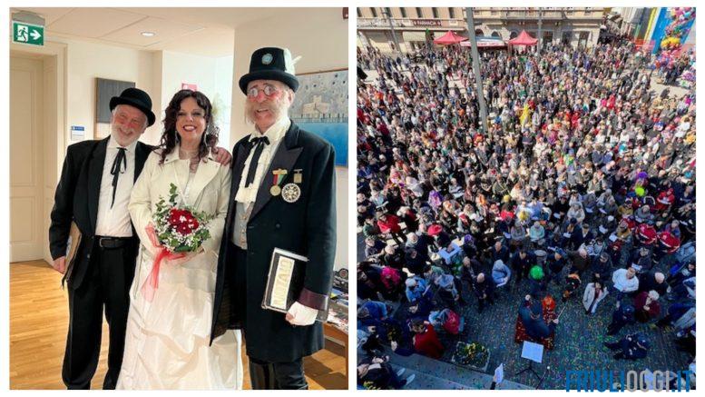 La giornata clou del 141° Carnevale Monfalconese è iniziata con il suggestivo corteo degli Sposi che, dalle 9.00, ha attraversato la città partendo dalla sede della Pro Loco in via Mazzini per poi giungere, con la sua carrozza nera trainata da due cavalli bianchi, nella piazza principale.