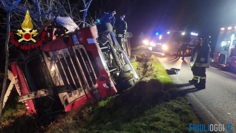 Il sinistro è accaduto intorno alle 19 sulla ex SP40 Via Ferrata, dove il camion che trasportava acqua è uscito autonomamente dalla carreggiata ed è finito sul fianco, nel fossato laterale. Sul posto sono intervenuti i vigili del fuoco di San Vito al Tagliamento, supportati da un mezzo polisoccorso pesante dalla sede centrale di Pordenone.