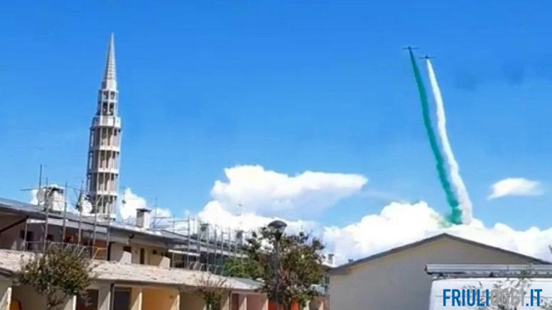 Le Frecce Tricolori hanno sorvolato Mortegliano, colpita dal maltempo.