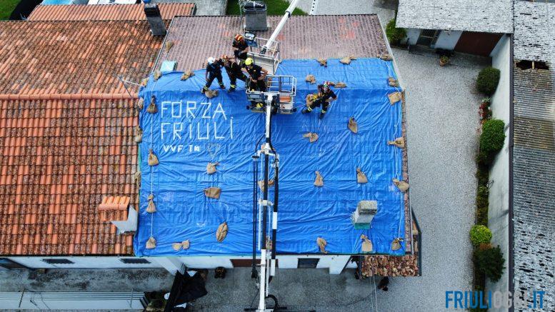 Su uno dei teli blu usati per la messa in sicurezza delle coperture del paese, il 95 per cento delle quali è rimasto danneggiato dalla grandine, campeggia una scritta bianca: “Forza Friuli”, con la firma (VVF TN).